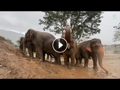 Because of their immense size and limited sweat glands, rain showers are an incredibly effective way for elephants to cool down. This is why rainy periods are often their absolute favorite times! When the rain falls heavily, the drops cascading over their bodies are like a natural massage, offering both refreshment and relaxation. So, when a heavy downpour begins, Thong Ae often invites her entire herd to join her for a refreshing rain dance and a luxurious mud bath – essentially a grand group spa session! These beautiful moments clearly showcase the elephants' natural behavior. The sight of them together as a herd, revelling in the rain and strengthening their bonds, is a truly rare and stunning spectacle. But you can witness these incredible scenes right here at Elephant Nature Park.