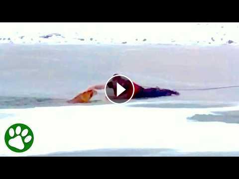 A pup falls through the ice and can barely hold on as a brave man crawls across the cracking surface to reach him. He manages to pull the exhausted dog to safety and guide him back to shore. The pup is finally reunited with his worried owner in a touching moment. This heartwarming rescue shows true bravery and compassion.