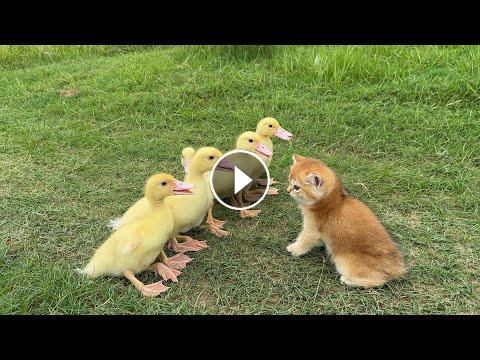 The incredible captain of the kitten leads the ducklings to wander the world!Interesting animal world.Cute animal video.Incredible animal behavior