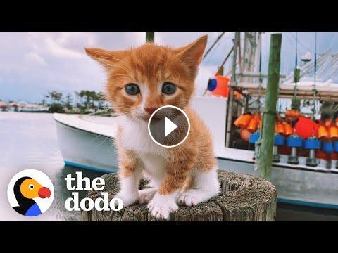 This kitten was raised by dogs — watch him run with the pack straight into the ocean the first time he goes to the beach!