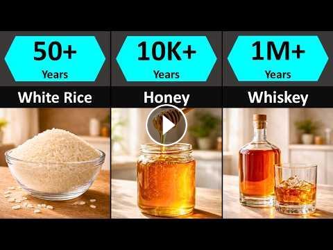 In this video, we compare 100 foods that have no real expiration date when stored properly. These include dry grains, salt, sugar, honey, canned foods, freeze-dried meals, spices, and high-alcohol liquids.