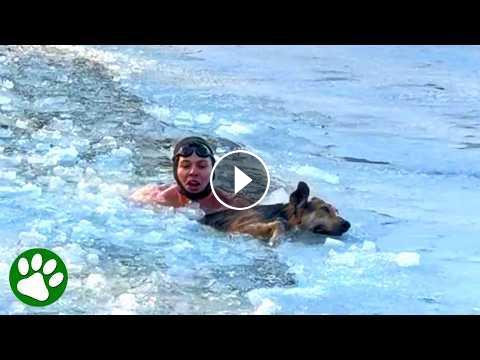 A brave man risks it all, jumping into ice-cold water to save a helpless, exhausted dog. After a long and grueling struggle, he finally brings her to safety