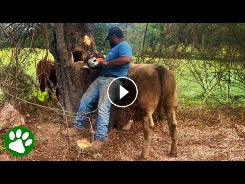 This lucky cow was saved by a compassionate hero with a chainsaw