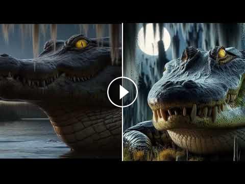 Twilight in the swamp. Moss hangs heavy from cypress trees. In the foreground, Big Joe Three Toe lurks half submerged, one yellow eye glowing as his tail stirs the water. Bullfrogs call under a full moon. The mood is dark, mysterious, and playful, with a weathered grit and a knowing grin on the gator’s face.