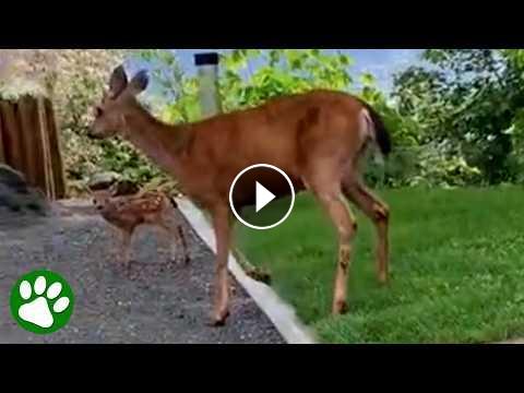 A baby fawn is stuck behind a fence, separated from its mother. It is found scared and alone by a kind woman, who manages to reunite the baby with its mother.