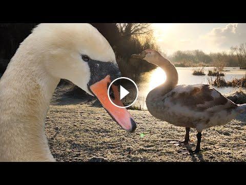 Enjoy the sight and sounds of swans on an icy lake. Listen to the gentle calls this swan family make and to the sound the swan cygnets make as they break through the ice - this was the first time these youngsters had seen it. Enjoy the sight as you soak up the beauty and peace of a winter's day.
