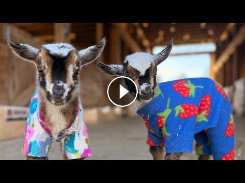 Honey (flower pajamas) & Harriet (strawberry pajamas) are so excited to be alive! At two days old, they already have all the moves and were happy to be out hopping in the sun in their cute pajamas with mama Rhubarb. Their older sister Lupin is likely going to kid today and has been making lots of noise! Thanks for stopping by the farm today to visit the kids! New babies likely arriving this afternoon! You can check them out on the live cam.