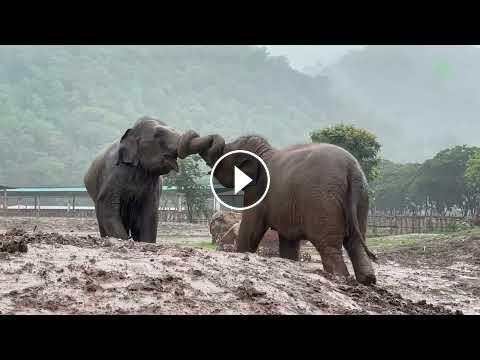 In elephant society and their natural behavior, they tend to be protective of their territory. Sometimes you'll see elephants pushing each other around a bit. This is because this is an area where elephants can roam freely. Many times, elephants will roam freely with each other. However, sometimes they don't like their territory disturbed as much as in this case. Lek Lek tries to push Mauy Lek, Chom Pu out of her territory.