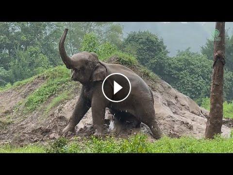 As gentle rain fell over Elephant Nature Park, young bull elephant Dok Rak embraced the joy of the moment. He waded into the muddy ground, his trunk swinging playfully as he rolled, sprawled, and pressed his body into the cool, wet earth. Mud splattered with every movement, coating his skin in a protective layer, while the rain washed over him like a soothing lullaby. With each playful roll, his carefree spirit shone through — a reminder that happiness can be found in the simplest pleasures. Watching Dok Rak lose himself in the rhythm of rain and earth was like witnessing nature’s poetry in motion, where freedom and contentment danced together in the heart of the park.