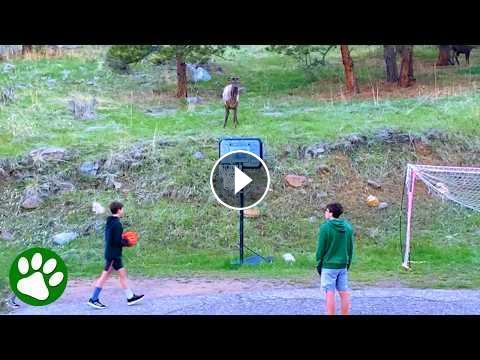 Two kids are playing soccer on their driveway when a wild elk walks up, joins the game, and even passes the ball back.