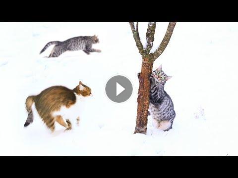 The garden is completely covered in thick snow — and the cats couldn’t be happier. Watch Foxy and Missy burst into zoomies, chase each other through the snow, climb trees, and set up playful ambushes while Petit watches with wide, excited eyes.